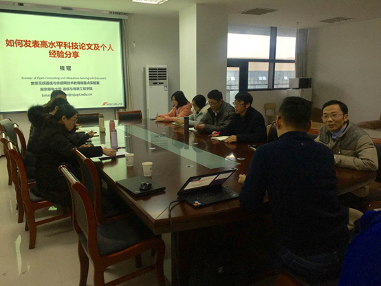 邀请南京邮电大学桂冠教授、博士生导师作为主讲报告人,在学院616会议室举办了学术论文写作交流会,学院相关方向的专业教师、联合培养研究生参加了讨论会,讨论会由王池社副院长主持。