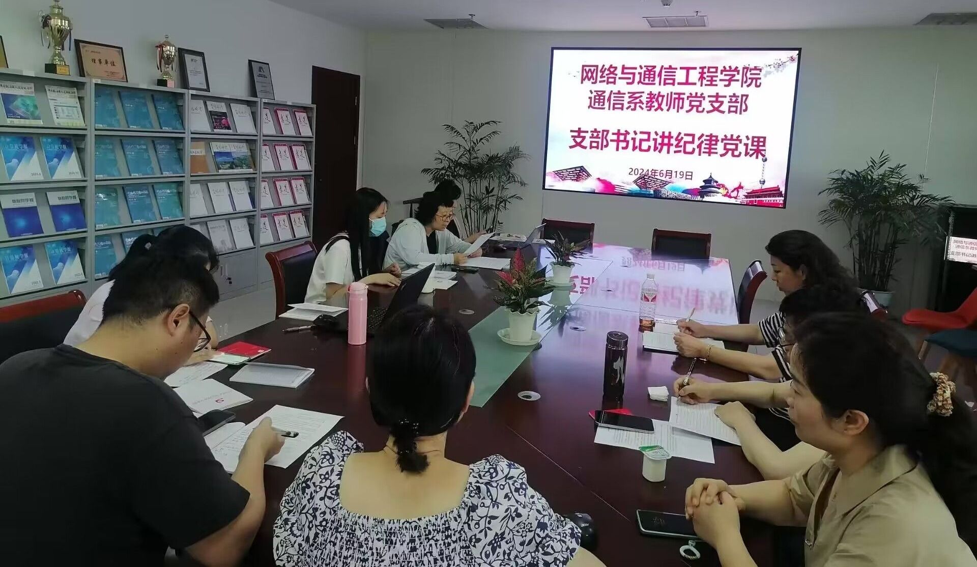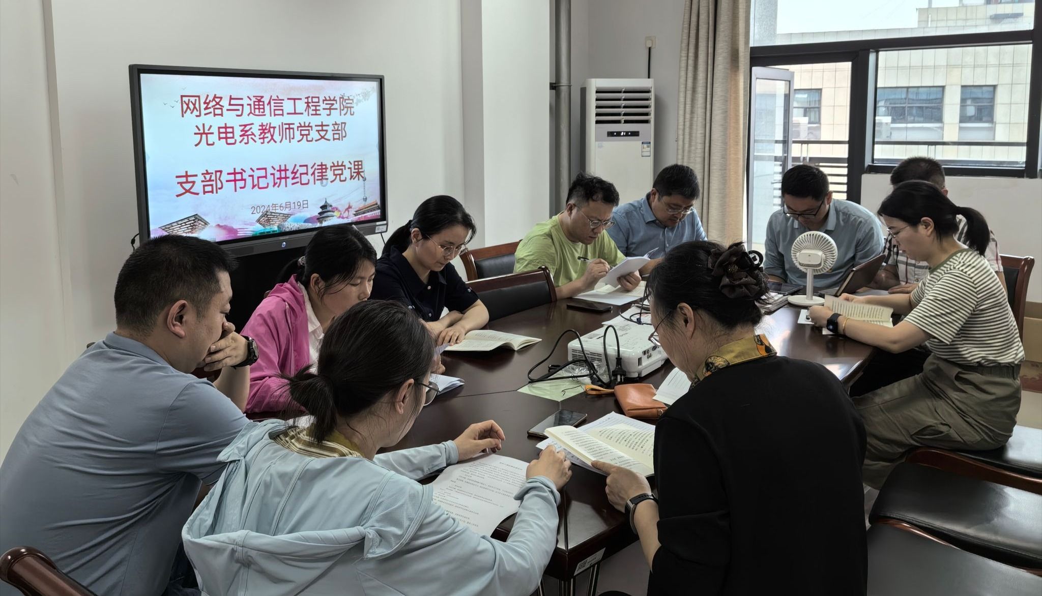 各支部首先学习了习近平总书记今年3月份以来关于党纪学习教育的重要论述,各支部书记领学了近期出版的《习近平关于全面加强党的纪律建设论述摘编》。通信系教师党支部书记吴杰和光电系教师党支部书记叶全意围绕《中国共产党纪律处分条例》修订内容、新增条款、学习贯彻措施等方面进行深入解读。机关实验室教工党支部书记朱湉湉为以“学纪、知纪、明纪、守纪”为主题,从学纪筑牢信仰之基、知纪坚守红色底线、明纪增强规矩意识、守纪清正廉洁展现担当四个方面引导党员在党纪学习教育中履职尽责做好表率。学生党支部书记朱艳红围绕“六大纪律”展开,党课结合学生党员容易出现的风险问题和实际案例教育党员要切实把“六项纪律”落实到日常学习、工作和生活中,抵制不良诱惑,做到清清白白做人,踏踏实实做事。最后,全体师生党员结合个人实际情况,对照“六项纪律”查摆问题风险,并依次做检视整改发言。