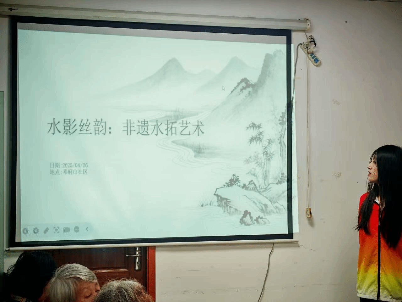 活动伊始,志愿者陈婷为老年朋友们开展入门培训,结合史料简述水拓画的千年传承历程。据悉,水拓画起源于唐代“墨池法”,经丝绸之路传至海外,2014年被联合国教科文组织列入世界非物质文化遗产名录。随后,教学视频直观呈现丝巾水拓画创作流程,引发老人们的浓厚兴趣。培训结束后,志愿者为老人们分发水拓颜料、素色丝巾、画针等工具,将创作步骤拆解为“滴色、塑形、拓印”三个关键环节,边示范边细致讲解技巧。针对视力不佳、手部协调性较弱的老人,志愿者一对一耐心指导,调整颜料比例、辅助铺平丝巾,确保每位老人都能参与其中。