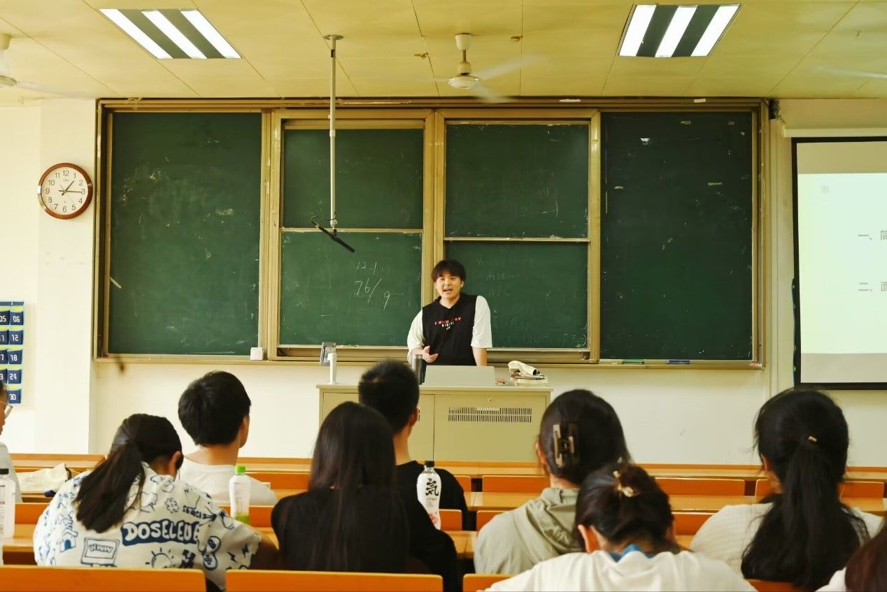 在1232教室举办毕业生经验交流会。高泓、牛清玮、于武巧、李长鹏四位19届学长学姐介绍考研、求职经验,部分大一、大二、大三学生参加了交流会。