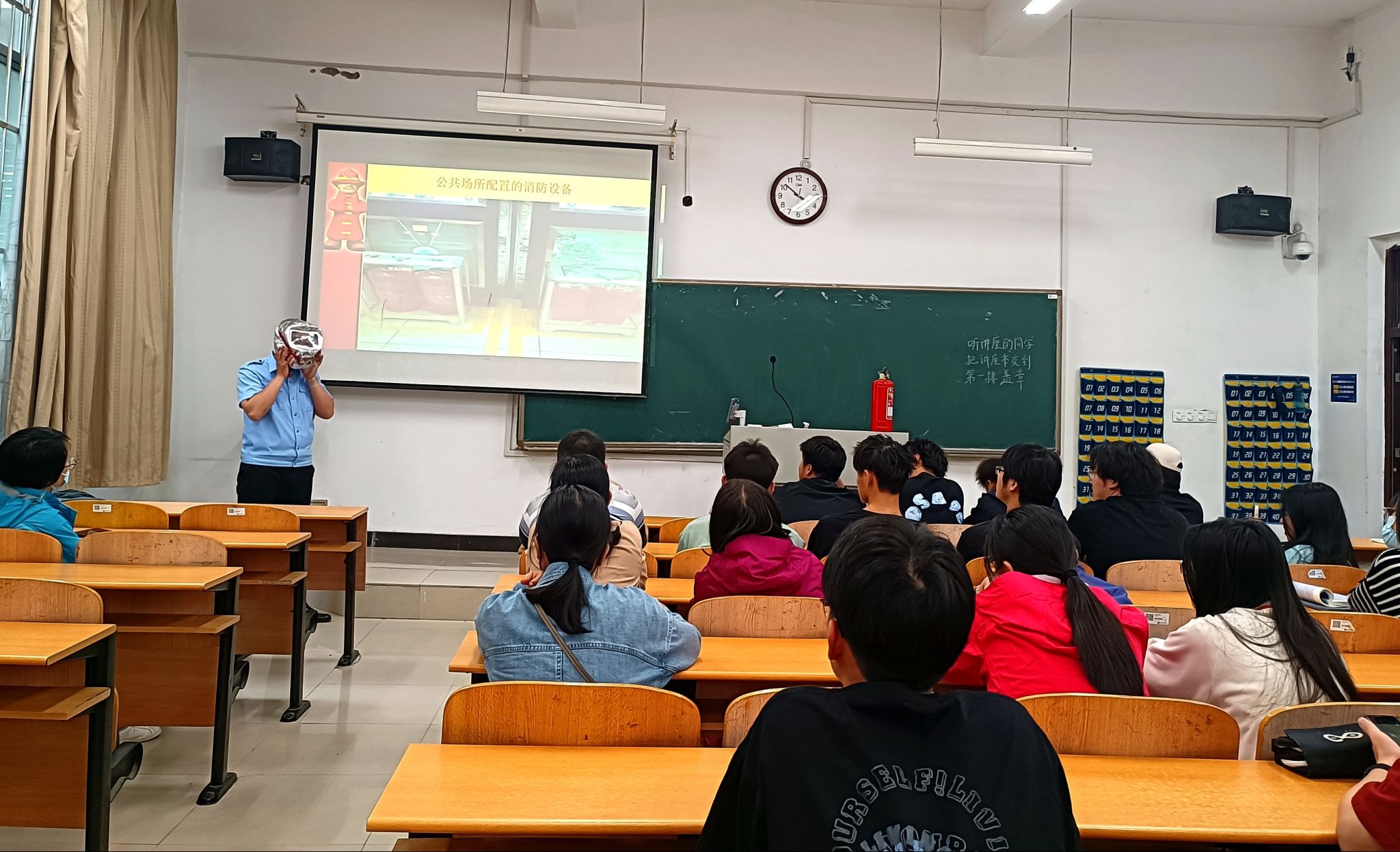 金涛教员通过多媒体播放火灾现场视频、展示火灾事故图片、现场互动等方式,向大家介绍了引发火情的原因及造成的危害,详细讲解了发生火灾后的自防、自救及逃生技能,并按种类、功能、用途介绍了不同的灭火器材及使用方法。通过现场演示,指导大家如何使用灭火器、安全锤等有关消防器具。同学们纷纷表示,此次培训活动帮助大家掌握了逃生、自救、报警、初期火灾扑救等消防常识,具有很强的指导性和操作性。