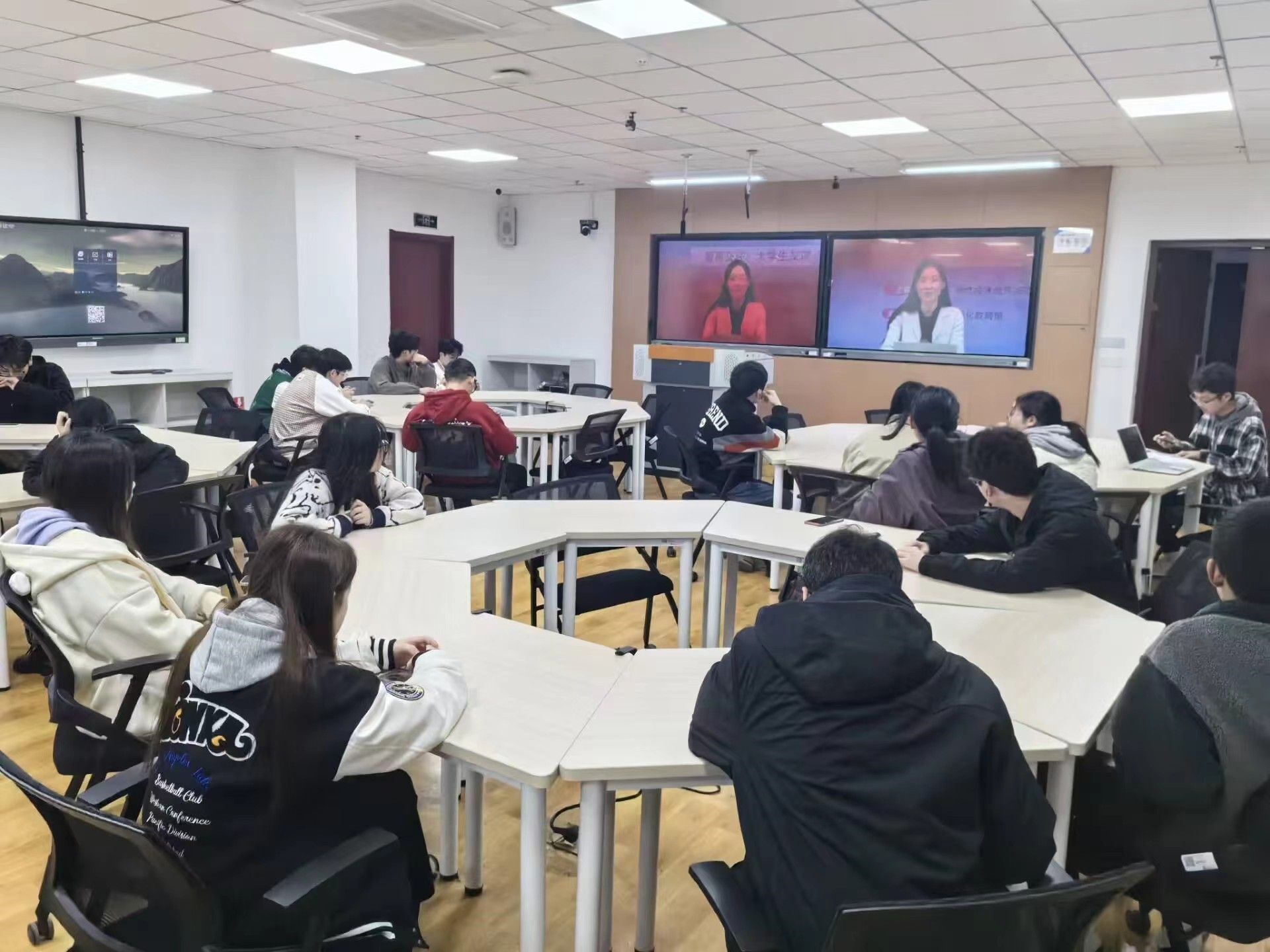 在科技楼604-1组织22级和23级宿舍心理联络员收看直播课《智慧交往:大学生友谊“三元素”》。