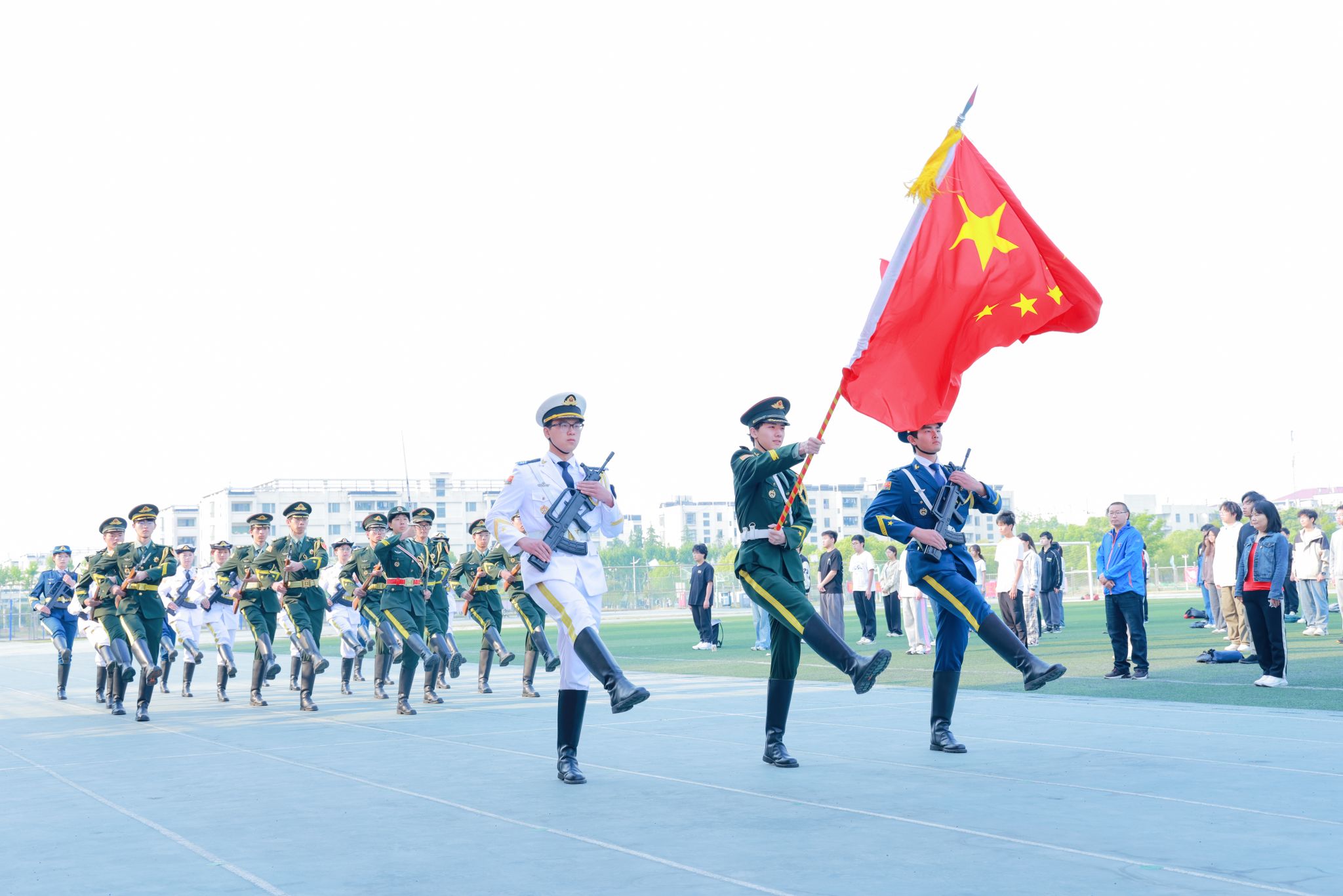 师生齐聚江宁校区北区田径场,隆重举行升国旗仪式,共上“国旗下的思政课”。本次仪式由党委学生工作部、党委人民武装部主办,主播视频