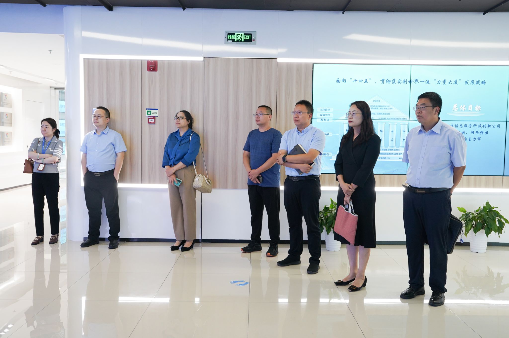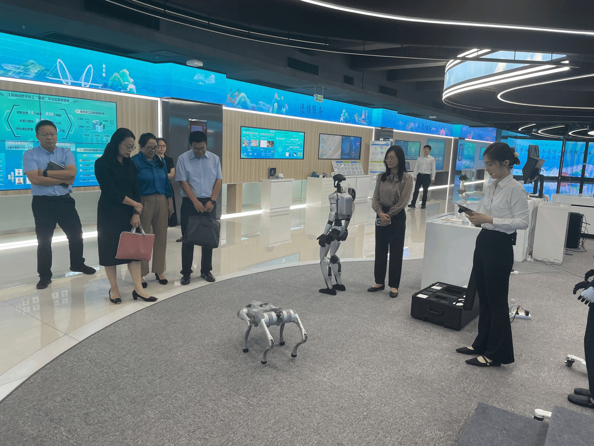 的领导和老师们首先参观了江苏移动创新展示体验中心,深入了解5G、人工智能、云计算等新一代信息技术在工业、农业、医疗、交通等领域的创新应用,感受数字技术如何赋能生活,推动社会高质量发展。参观后,双方在企业会议室召开了交流座谈会,南京移动公司校园中心主任程庆对公司基本情况进行了介绍,他强调中国移动以创世界一流企业,做网络强国、数字强国为目标,始终致力于推动信息通信技术服务经济社会民生;人力资源部副经理李冰清对公司用工情况进行了介绍,他强调南京分公司将持续优化人力资源配置,加快锻造高效协作的干事创业队伍,加强校企合作,为毕业生开拓更多的高质量就业岗位。