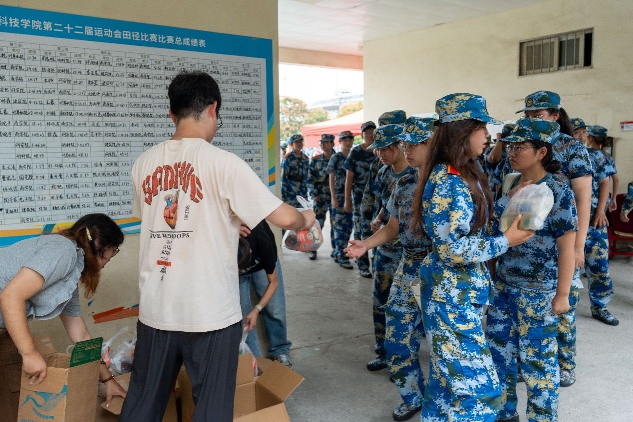 活动当天,学联同学早早准备好饮料、面包、零食等慰问物资,带着满满的热情来到军训场地,当看到新生们整齐划一的队列、刚劲有力的动作时,纷纷为大家的精气神点赞。上午训练结束后,学联同学将分装好的慰问物资一一送到新生手中,新生们脸上露出了欣喜的笑容,连日训练的疲惫仿佛也消散了不少。除了物资慰问,主播视频