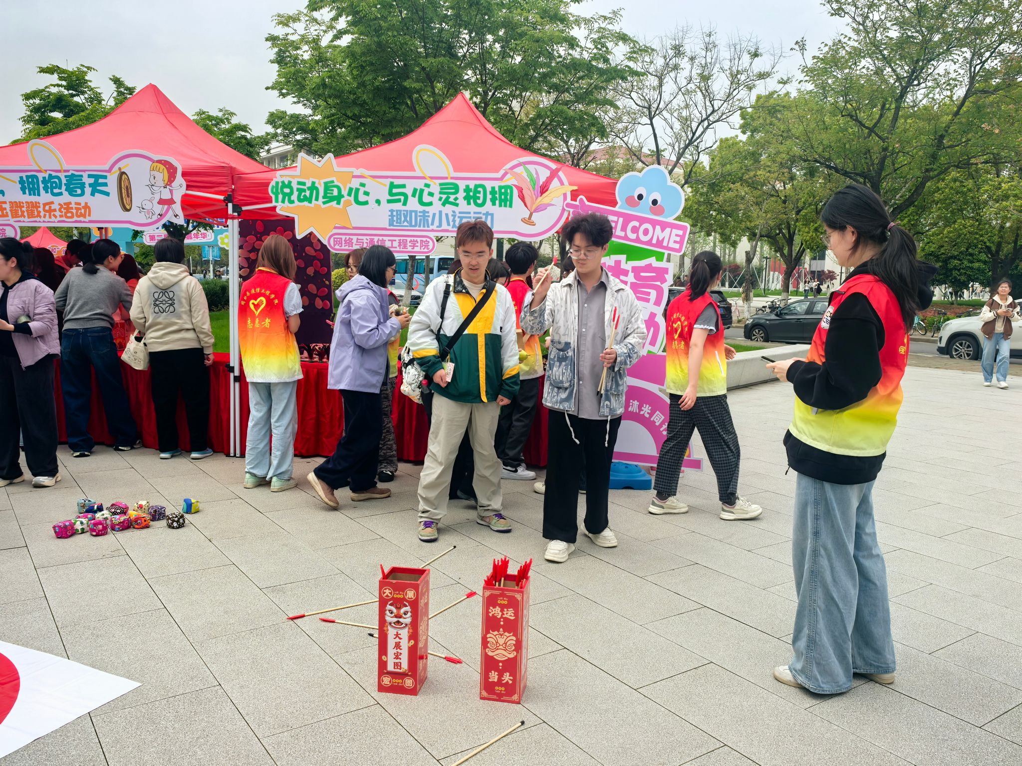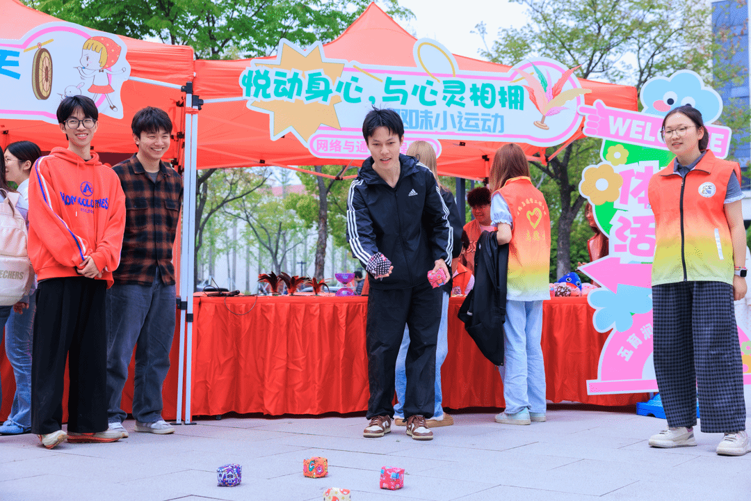 摊位重点设置两大趣味运动体验区,以传统休闲体育项目为载体,让同学们在轻松玩乐中卸下疲惫、滋养心灵。快乐踢毽子与抖空竹体验区里,彩色的毽子轻盈起落,灵动的空竹旋转翻飞,同学们欢声笑语不断,随性自在的互动不仅拉近了彼此的距离,更在肢体的舒展中实现了身心的双重放松。与此同时,趣味投壶、丢沙包两个项目也人气爆棚,同学们专注瞄准、从容投掷,在一次次尝试与命中中转移负面情绪,在小小的成就感里重拾轻松与自信,充分感受运动带来的心理疗愈力量。
