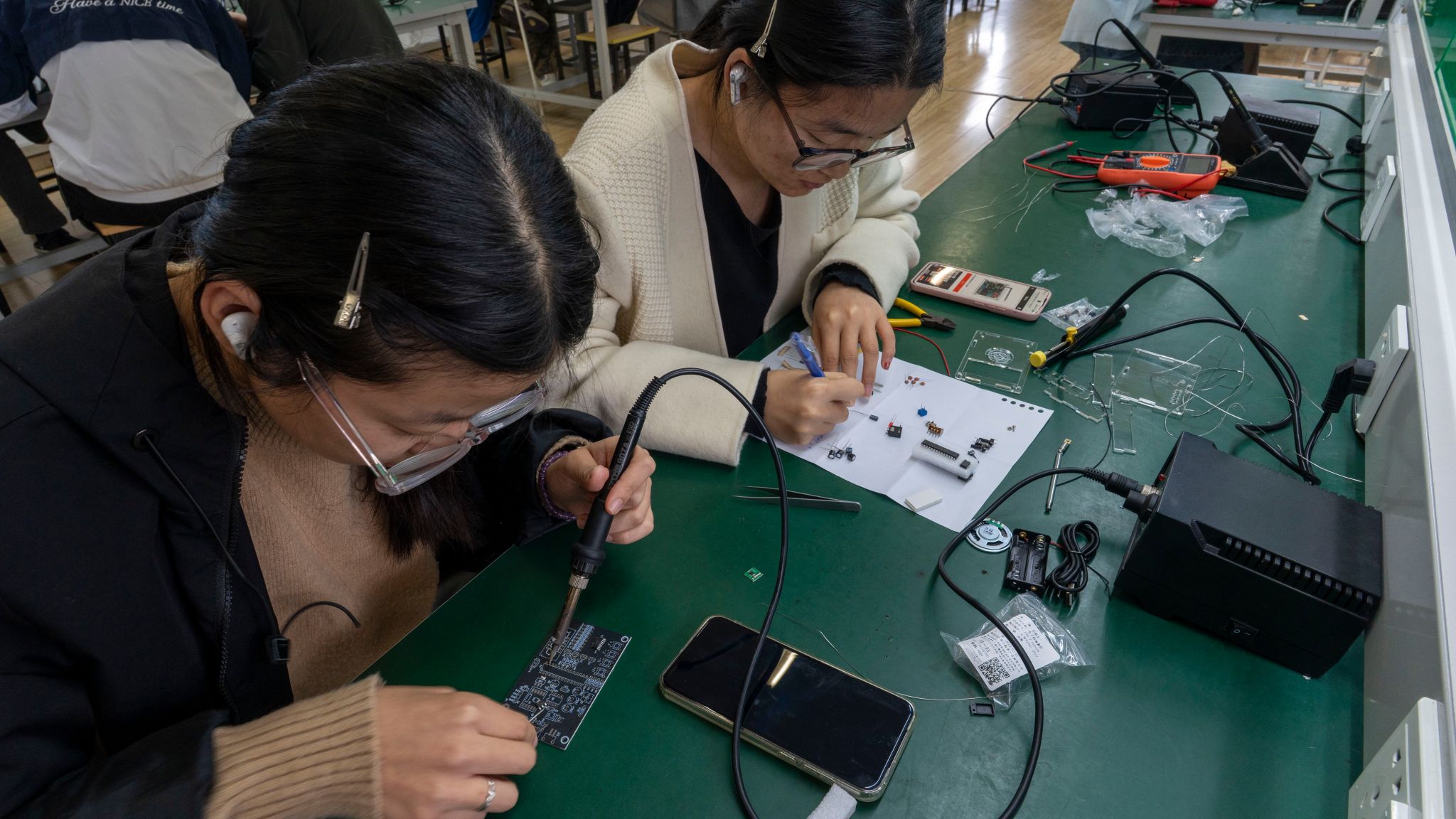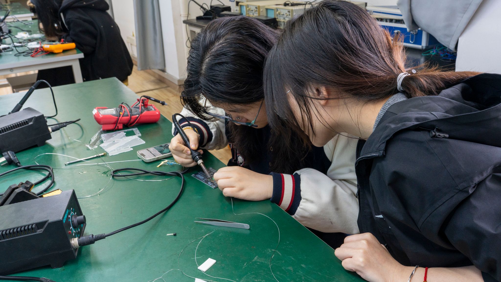 在工科楼C402顺利进行了第三届电子焊接比赛,比赛邀请到了光电系陈鹏和通信系李翔两位老师担任评委,参赛同学们同台竞技焊接技艺,展现了主播视频