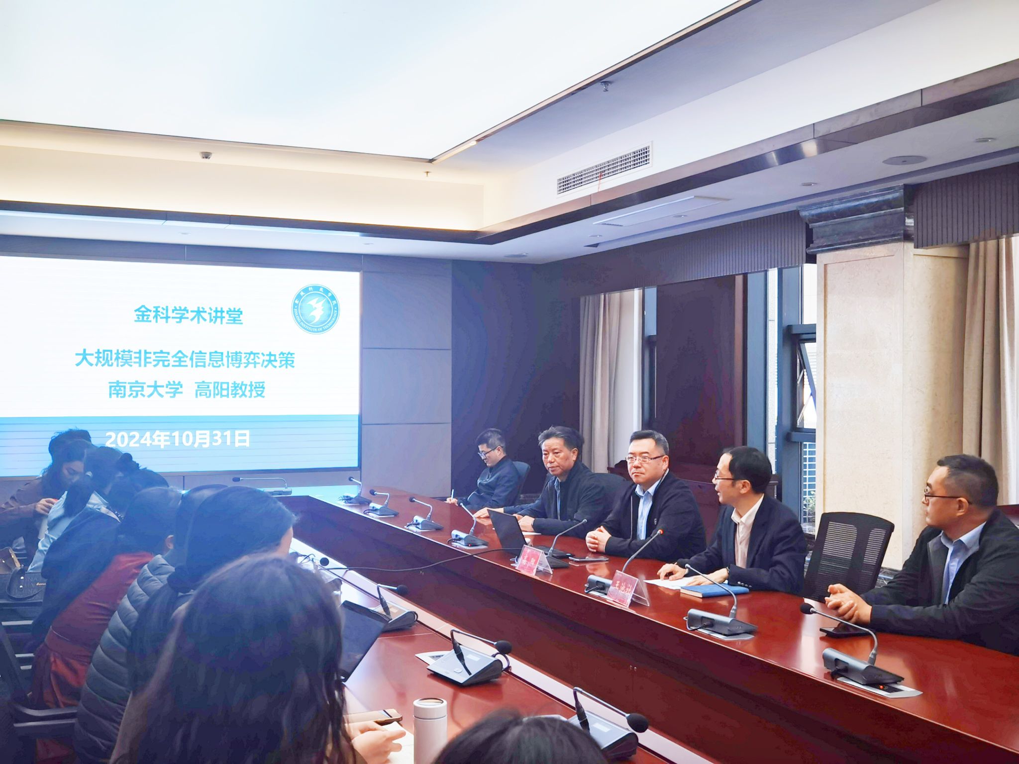 承办的2024年第30期金科学术讲堂在科技楼4号楼裙楼会议室顺利开讲。本期学术讲堂邀请了南京大学高阳教授为学校师生开展题为《大规模非完全信息博弈决策》的学术讲座。讲座由主播视频